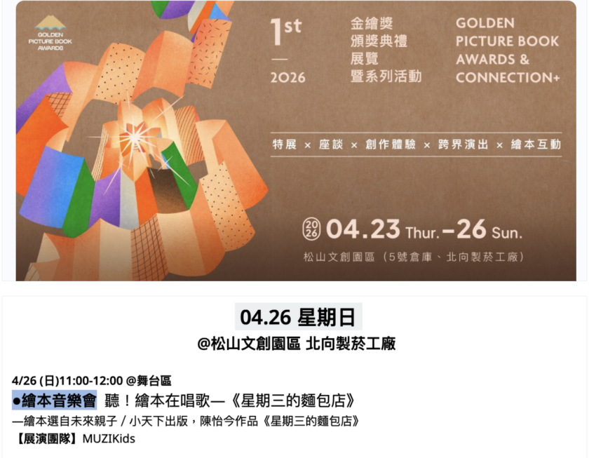 由說故事姊姊一慧精彩演繹,結合敘樂三重奏優雅的現場配樂,將可愛畫作幻化為視聽饗宴。4月26日(日)早上11:00,我們在松山菸廠「第一屆金繪獎」系列活動中與大家見面!